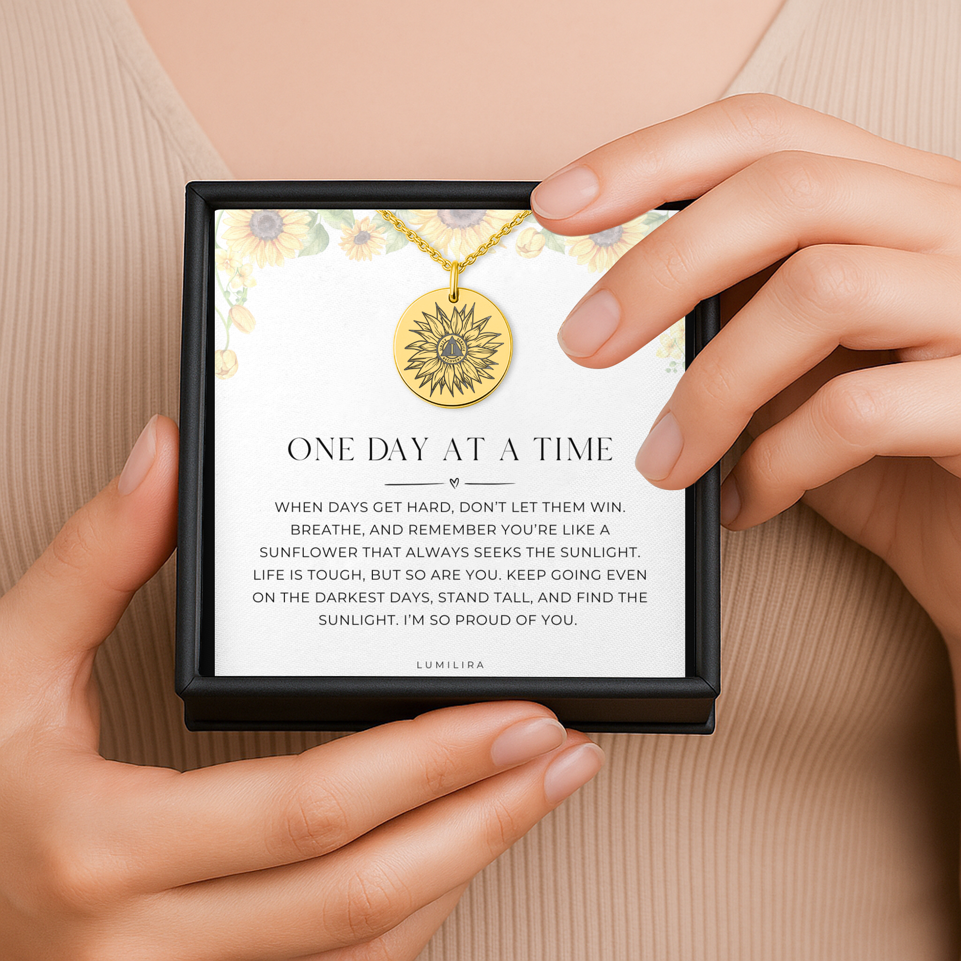 Celebrate every sober milestone with a symbol of hope and renewal. This sunflower necklace shines as a daily reminder to take life one day at a time and to keep seeking the light no matter how tough the journey gets.
