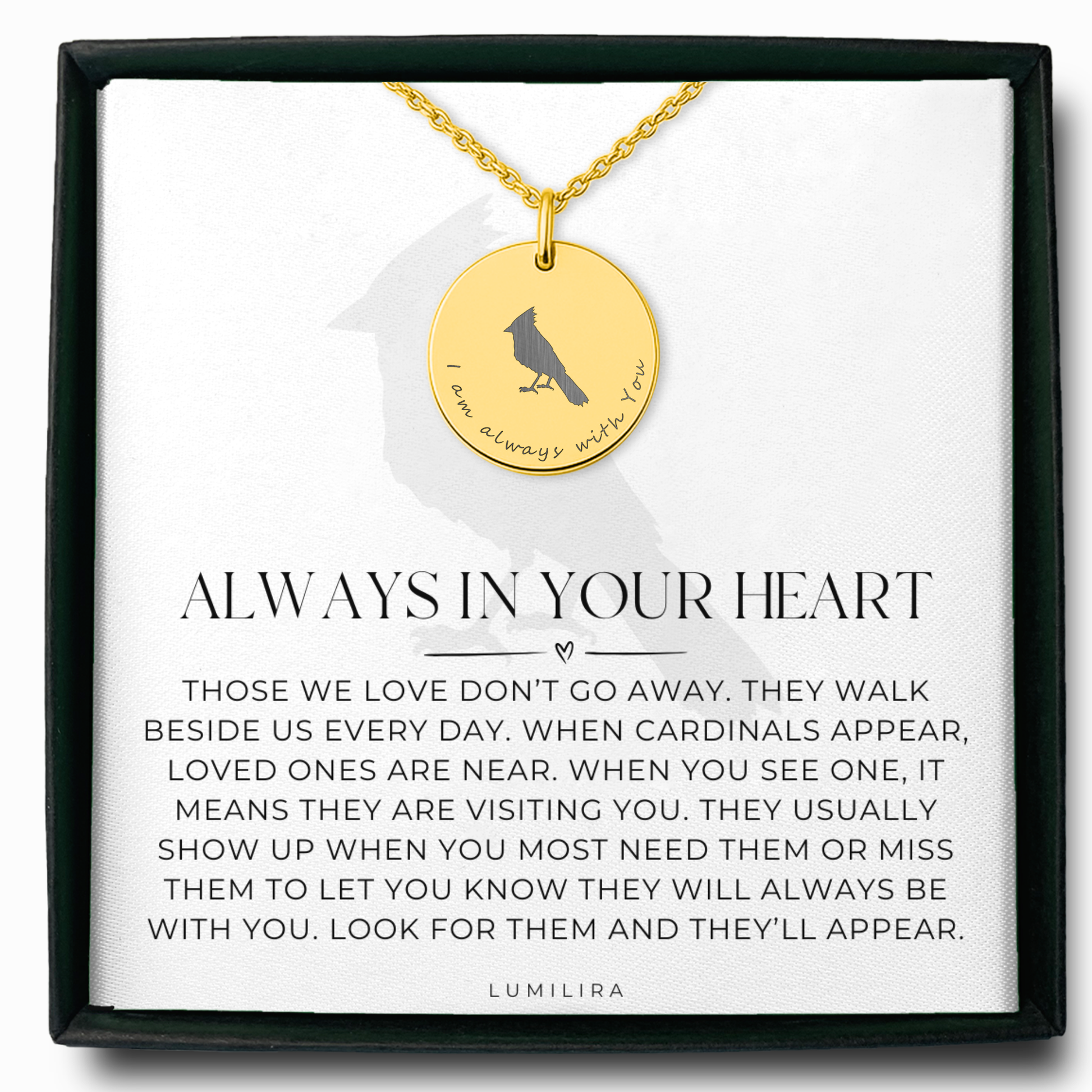 Whether for a daughter, friend, or family member, this necklace is a meaningful sympathy gift. Featuring a symbolic cardinal and the touching message “Always In Your Heart,” it represents the comforting belief that those we’ve lost remain close, showing up when we need them most.