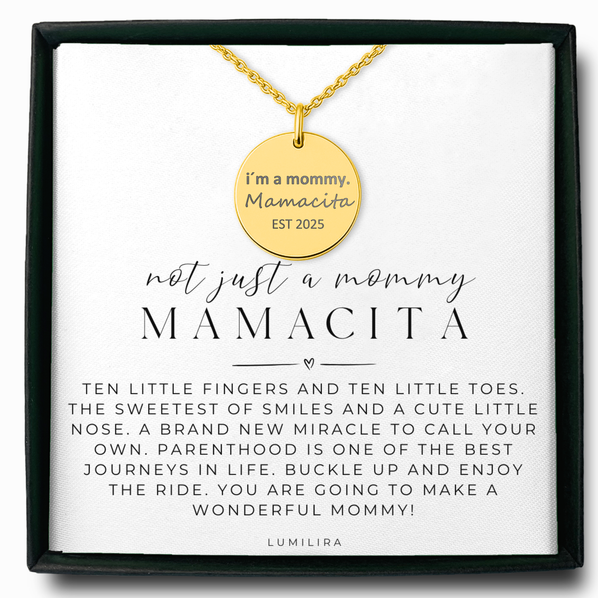 This isn’t just a necklace — it’s her badge of honor. With “I’m a mommy. Mamacita.” and her custom EST year, it captures the day her life was forever changed. It’s a daily spark of pride, a whisper of resilience, and a playful wink for the mama who juggles bottles, bedtime, and her own dreams.