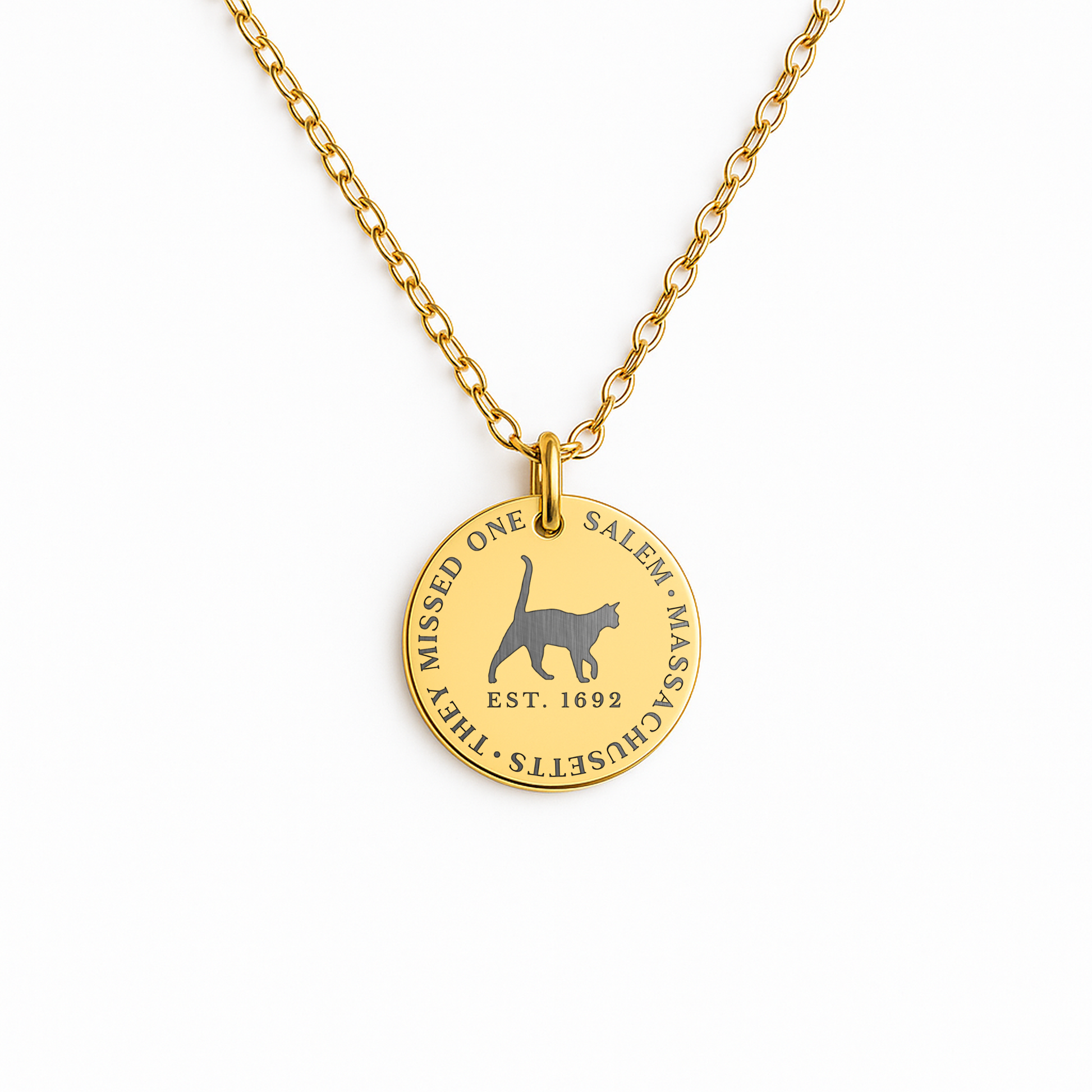 “They Missed One – EST 1692.” Featuring a bold cat design, this necklace is a tribute to survival, strength, and the spirit of Salem. Just like the cat — independent, mysterious, and impossible to tame — this piece reminds the wearer of their resilience and unshakable power.